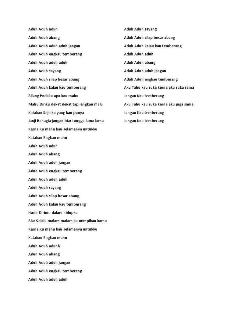 C g am kau boleh jauhi diriku f em dm namun kupercaya f g am kau kan mencintaiku dm dan tak akan pernah… reff ii: Aduh aduh aduh aduh aduh aduh sayang aduh aduh silap besar abang aduh aduh kalau kau temberang. 13 june at 16:04 ·. Bilang padaku apa kau mahu mahu diriku dekat dekat tapi engkau malu katakan saja ku yang kau punya janji bahagia jangan biar tunggu lama lama. Ikut hati hendak lari mana pergi engkau cari tak tau diam sakit hati mata lebam takut nanti apa yang kau mahu.