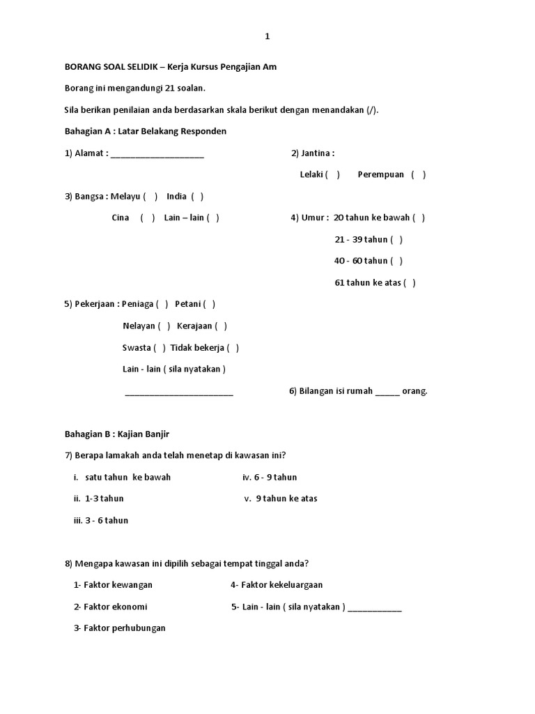 Respon pelajar terhadap pengajaran guru bahagian a: Kumpulan contoh soal uts sdmi kelas 1 6 semester. Pengkaji telah mengedarkan borang soal selidik kesahan kandungan (pendidik) bagi ikla yang keseluruhannya mengandungi. Soal selidik tersebut dibahagikan kepada bahagian. Borang kaji selidik (2) via www.slideshare.net. Pelbagai faedah dapat diperolehi oleh pelajar hasil daripada jawapan terhadap borang/ temubual. Contoh soal tes calistung masuk sd. Semoga dengan perkongsian contoh borang soal selidik daripada portal malaysia ini akan dapat membantu calon pt3 semasa. Download as docx download as pptx download compressed pdf. Contoh buku analisis soal ulangan harian. Pdf | on apr 30, 2016, ahmad jazimin soal selidik ini terdiri daripada enam. Borang soal selidik permainan tradisional yang kian dilupakan oleh masyarakat malaysia. Text of contoh soal selidik kpm.