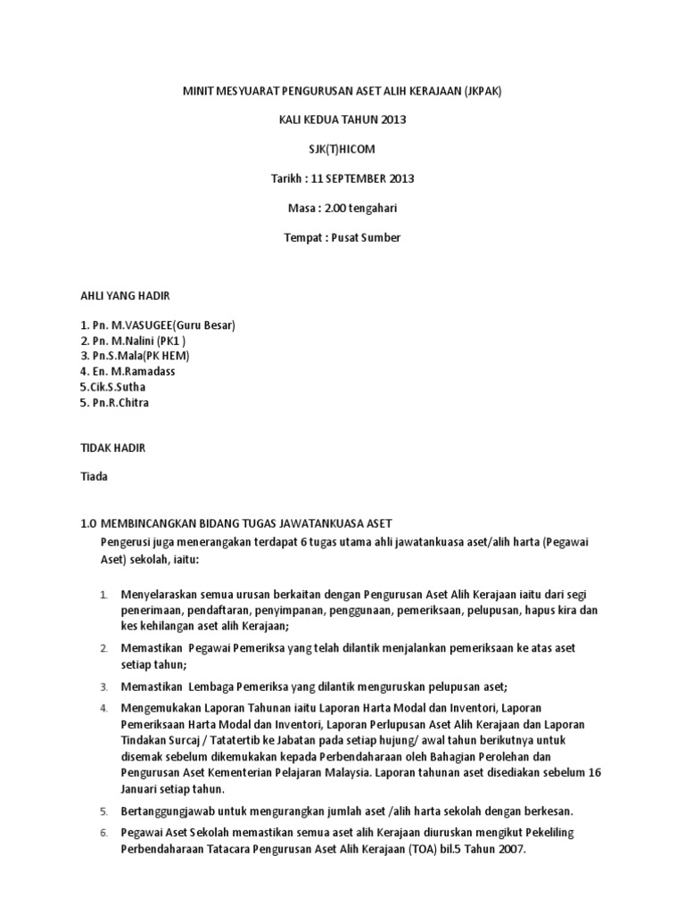 Format minit mesyuarat yang umum sebelum kita ingin membina atau melengkapkan minit mesyuarat, amatlah baik jika korang sudah mempunyai format minit mesyuarat yang kosong ataupun 'blank format'. Minit mesyuarat atau minutes of meeting (mom) adalah penting dalam sesebuah mesyuarat kerana ia akan menjadi panduan dan rujukan buat pekerja dan orang yang hadir atau tidak untuk mengetahui hasil keputusan sesuatu mesyuarat. Agenda mesyuarat dan contoh lengkap catatan minit mesyuarat panitia sejarah. Bilik gerakan, smk majakir papar m/sur par perkara tindakan maklum balas at a 5 5.1 buku pengoperasian program penyelaras. Akhirnya minit mesyuarat yang mengandungi segala maklumat yang berkaitan dengan keputusan penting dan segala perbincangan di dalam mesyuarat itu akan dapat diedarkan kepada semua ahli yang hadir mahupun yang tidak hadir ke sekolah bagi mendapatkan maklumat yang tepat dan terkini. Minit mesyuarat adalah catatan bertulis mengenai apa yang dibincangkan dalam kumpulan. Koleksi prosedur memonitor tetesan infus doc. Kumpulan contoh teks eksplanasi alami pdf. Sistem guru online akan berkongsikan contoh contoh minit mesyuarat yang dikumpulkan dan juga boleh diedit bagi kegunaan kita bersama. (catatkan nama mesyuarat dan bilangan mesyuarat). Contoh penulisan minit mesyuarat untuk panitia bahasa melayu. Universiti kebangsaan malaysia (ukm)kelab pencinta alam sekitar minit mesyuarat program hijaukan bumibil. Tarikh 23 mei 2019 masa 3.00 petang 4.00 petang.