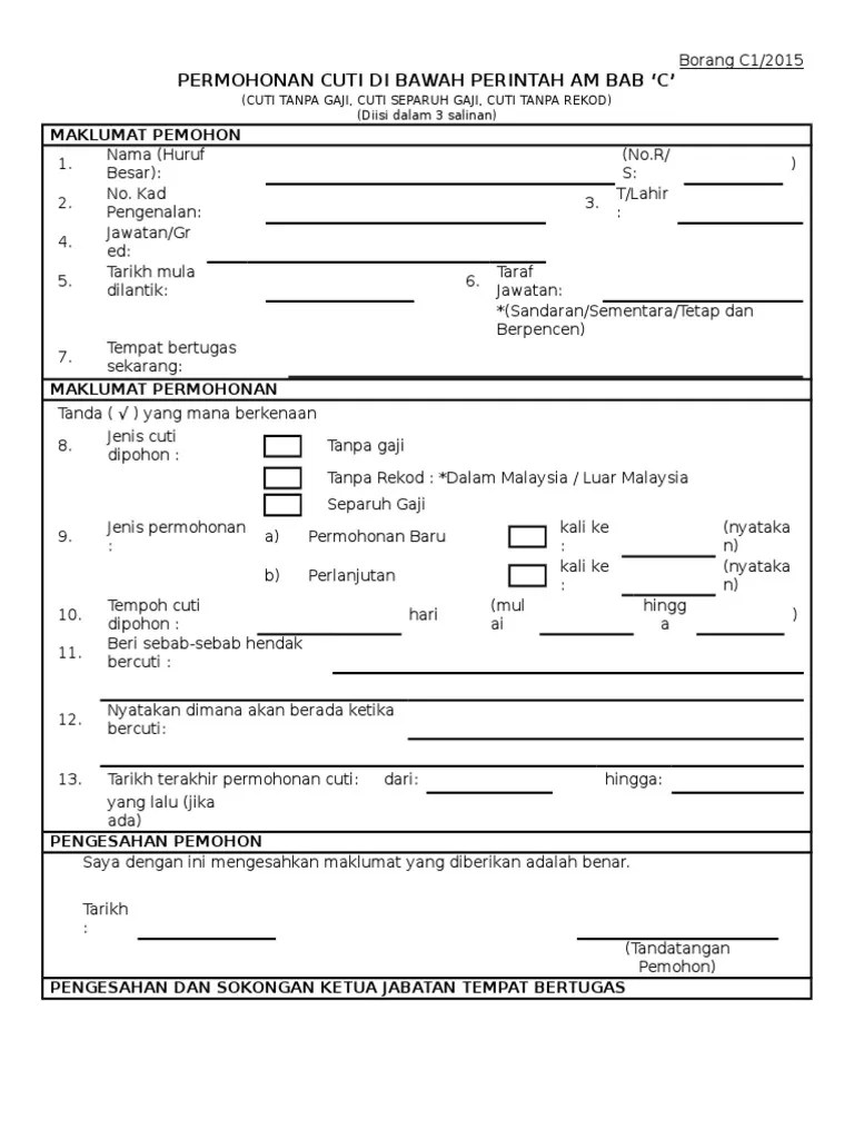 Deepavali disambut seluruh malaysia dan adalah cuti am kecuali di negeri sarawak. Moshims borang cuti tanpa rekod cute766. Kemudahan cuti tanpa rekod keagamaan selama 7 hari bagi tujuan umrah kepada umat islam dan juga kepada bukan beragama islam untuk tujuan 9. Kerajaan telah meluluskan kemudahan cuti tanpa rekod kepada pegawai beragama islam untuk menunaikan ibadah umrah sebanyak 7 hari sekali sepanjang. Berkuatkuasa pada 1 julai, kemudahan cuti tiga hari bagi urusan kematian anggota keluarga terdekat akan diberikan buat penjawat awam.