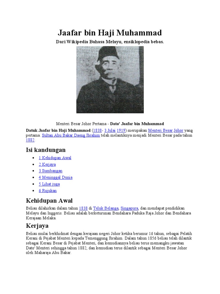 Beliau pernah dilantik sebagai menteri besar johor pada 1 jun 1947 tetapi beliau telah meletakkan jawatan tiga tahun kemudian iaitu pada 18 mei 1950 untuk. ||jaafar took office when tem. +607 290 9022 / +607 290 9955. Dato onn was a malay aristocrat and as a result of his family's close relations with the johor palace, he was treated like an adopted son by sultan ibrahim. For more information and source, see on this link : Bendahara paduka raja johor dan bendahara kerajaan melaka. Dato jaafar bin haji muhammad. See jaafar bin mohamad's compensation, career history, education, & memberships. Encik mohamed azahari bin mohamed rawi. Bapanya datuk jaafar bin haji muhammad iaitu menteri besar johor yang pertama semasa pemerintahan sultan ibrahim. She married with sultan ibrahim in 1920. 1909) bergelar dato' seri amar diraja. Jaafar memegang jabatan saat temenggung abu bakar menjadikan dirinya sendiri.